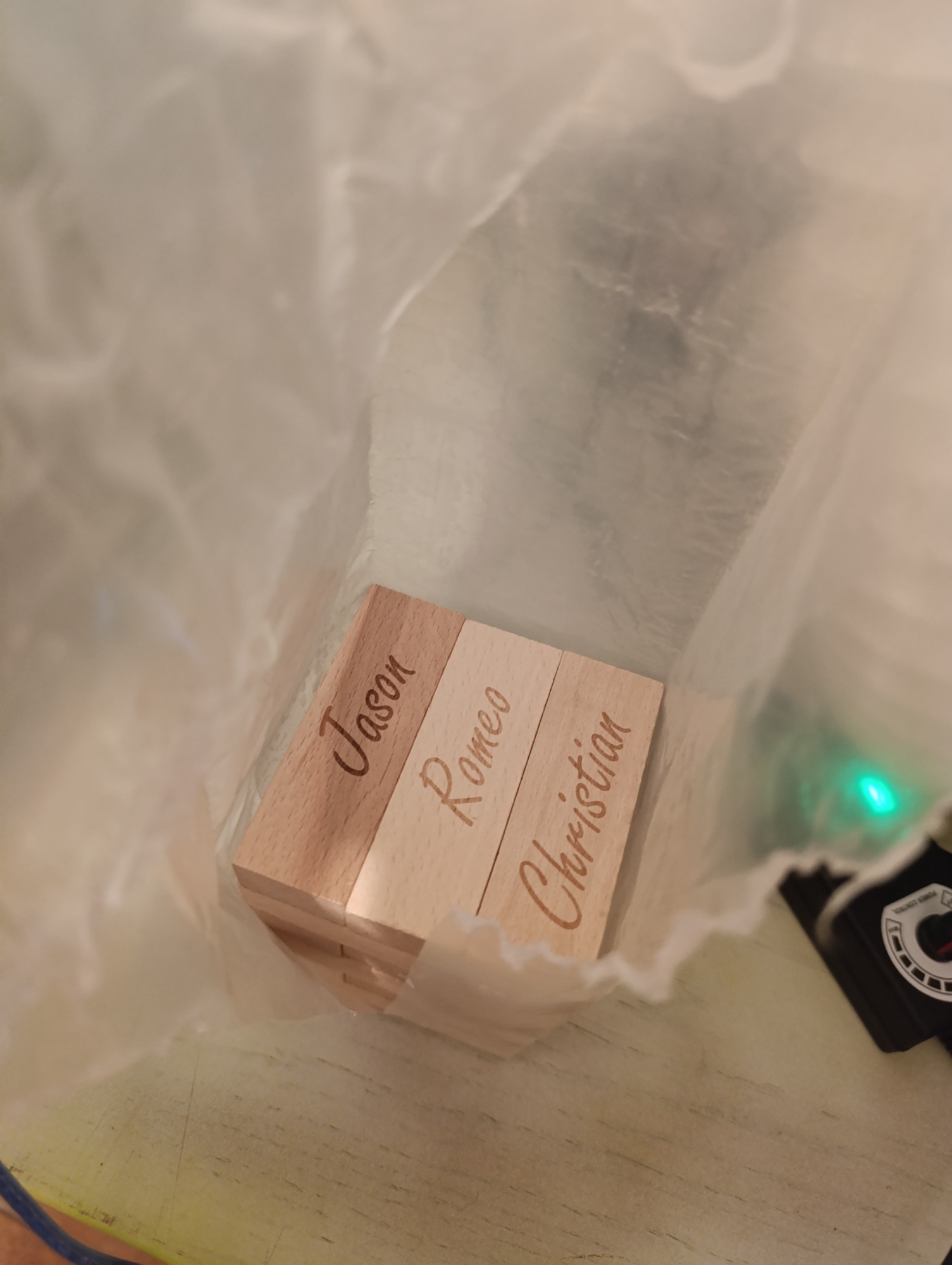 Hier eine Auftragsarbeit für einen Freund. Es ist ein personalisiertes Jenga Spiel als Hochzeitsgeschenk.